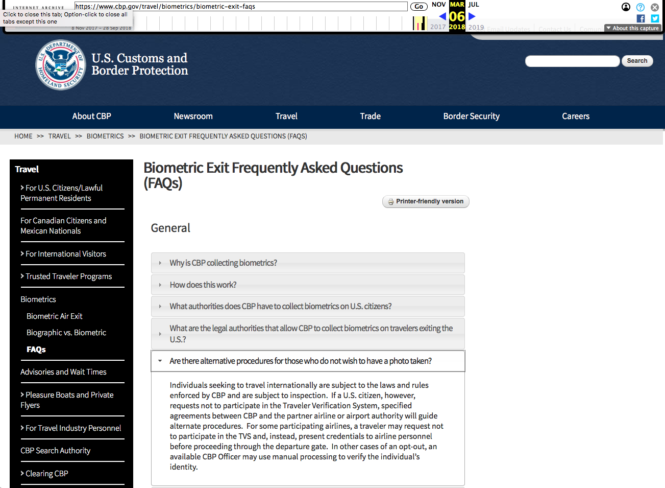 Individuals seeking to travel internationally are subject to the laws and rules enforced by CBP and are subject to inspection. If a U.S. citizen, however, requests not to participate in the Traveler Verification System, specified agreements between CBP and the partner airline or airport authority will guide alternate procedures. For some participating airlines, a traveler may request not to participate in the TVS and, instead, present credentials to airline personnel before proceeding through the departure gate. In other cases of an opt-out, an available CBP Officer may use manual processing to verify the individual’s identity. (screenshot)