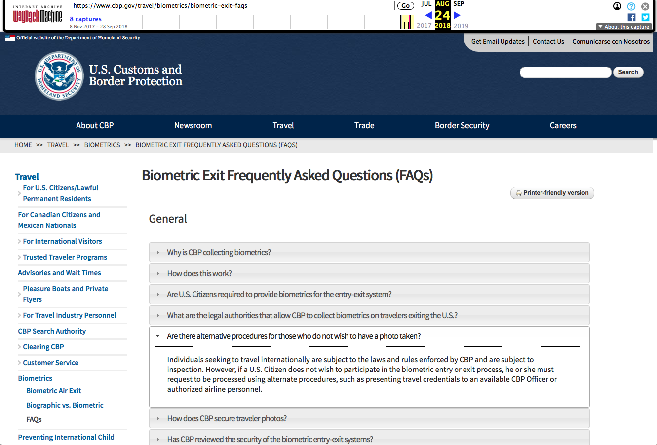 Without any formal procedure in place, CBP has frequently changed the FAQs provided on the agency's website with regard to opt-out procedures. As of December 11, 2018, the FAQs read: