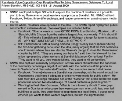 One of the example social network monitoring summaries is titled "Residents Voice Opposition Over Possible Plan to Bring Guantanamo Detainees to Local Prison-Standish MI." The report summarizes dissent on blogs and social networking cites, quoting commenters.