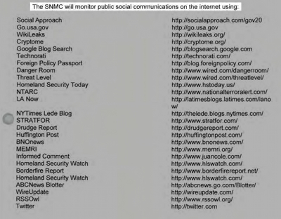 The DHS instructed the company to "Monitor public social communications on the Internet." The records list the websites that will be monitored, including the comments sections of [The New York Times, The Los Angeles Times, the Huffington Post, the Drudge Report, Wired, and ABC News.]"